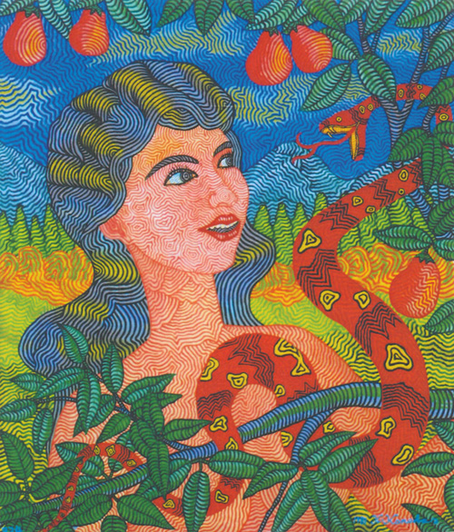 2014年 金子治男 アクリル画 F10号 53×45cm 旧約聖書の創世記の中には、人類最初の女であるエバが、蛇に欺かれ、神によって禁じられた木の実を食べてしまった事が記されている。多くの人々はこの記録が神話、又は作り話による童話のように考えているが、聖書全体が神の霊感によって書かれた書物であり、進化論が誤りであるという十分な科学的な証拠がある事を考えるなら、神が最初の人間アダムとエバを創造した事の真実性を考えた上で、この記録の意味する事柄を真剣に考えて見る必要がある。蛇は元々会話能力のあるものとして造られた訳ではない。しかし霊の世界からの働きがあるなら、動物が操られ、動物が人間に話しかけているように見せかける事は有り得ることである。蛇と言えば聖書の黙示録(又は啓示)20章1〜3節によると悪魔サタンの象徴である。つまり最初の女エバは、霊界に実在する悪魔サタンに欺かれ神によって禁じられた木の実を食べるように唆されたのである。この出来事は単なる童話ではなく、全人類に重大な影響を及ぼした実話なのである。つまり、この世界に存在する全ての悪と苦しみの原因は、最初の人間アダムとエバが悪魔サタンに欺かれ、神によって禁じられた木の実を食べた事にあるのである。それ以来全人類は神の支配を離れ、悪魔サタンの支配下に入ったのである。その故に聖書では悪魔サタンの事を「この世の神」又は「この事物の体制の神」と述べている。(コリント第二4章4節)(黙示録又は啓示12章9〜12節)しかし近い将来に神はキリストによって比喩的な蛇である悪魔サタンをこの世から滅ぼし、新たに設立された神の王国によって真の世界平和をもたらすのである。 |